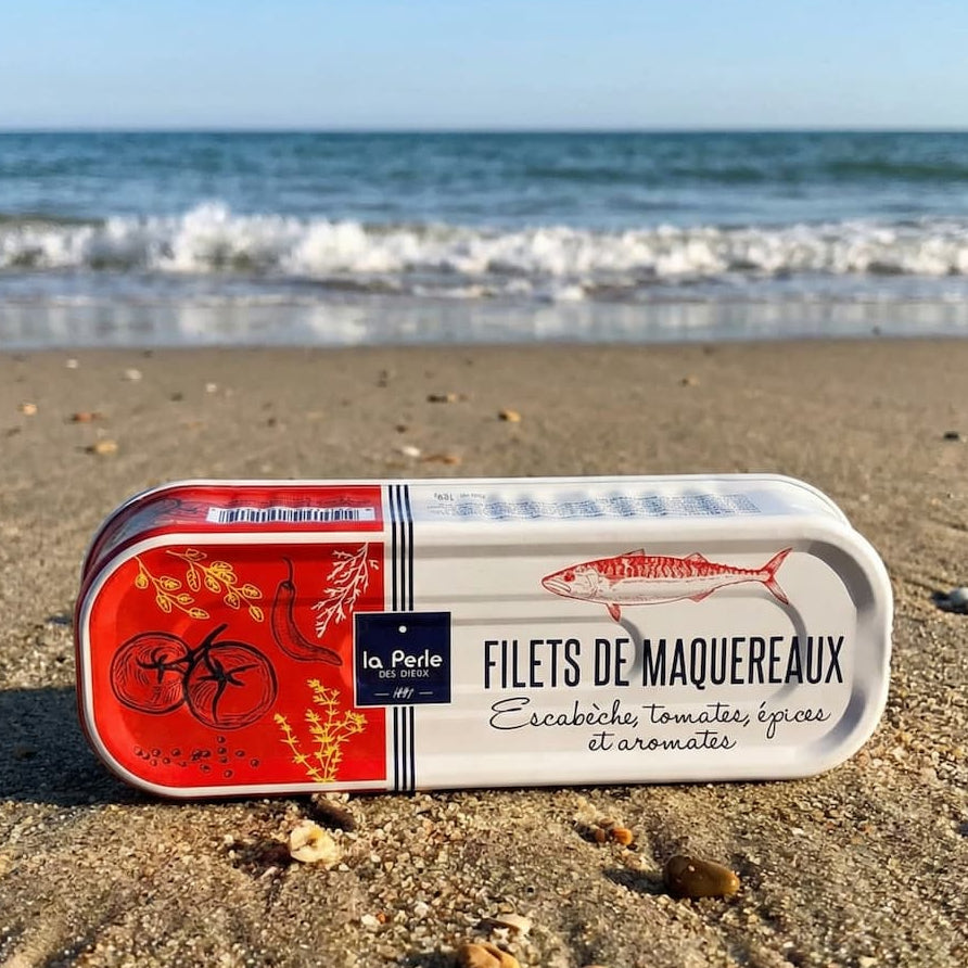 1 Dose Makrelenfilets à l' Escabeche - Die spanische Verführung: Eine großzügige Komposition aus süßen Tomaten, würzigen Gewürzen, knackigen Gurken und aromatischen Kräutern. Diese duftende, temperamentvolle Kombination harmoniert wunderbar mit einem frischen Muscadet-Weißwein.